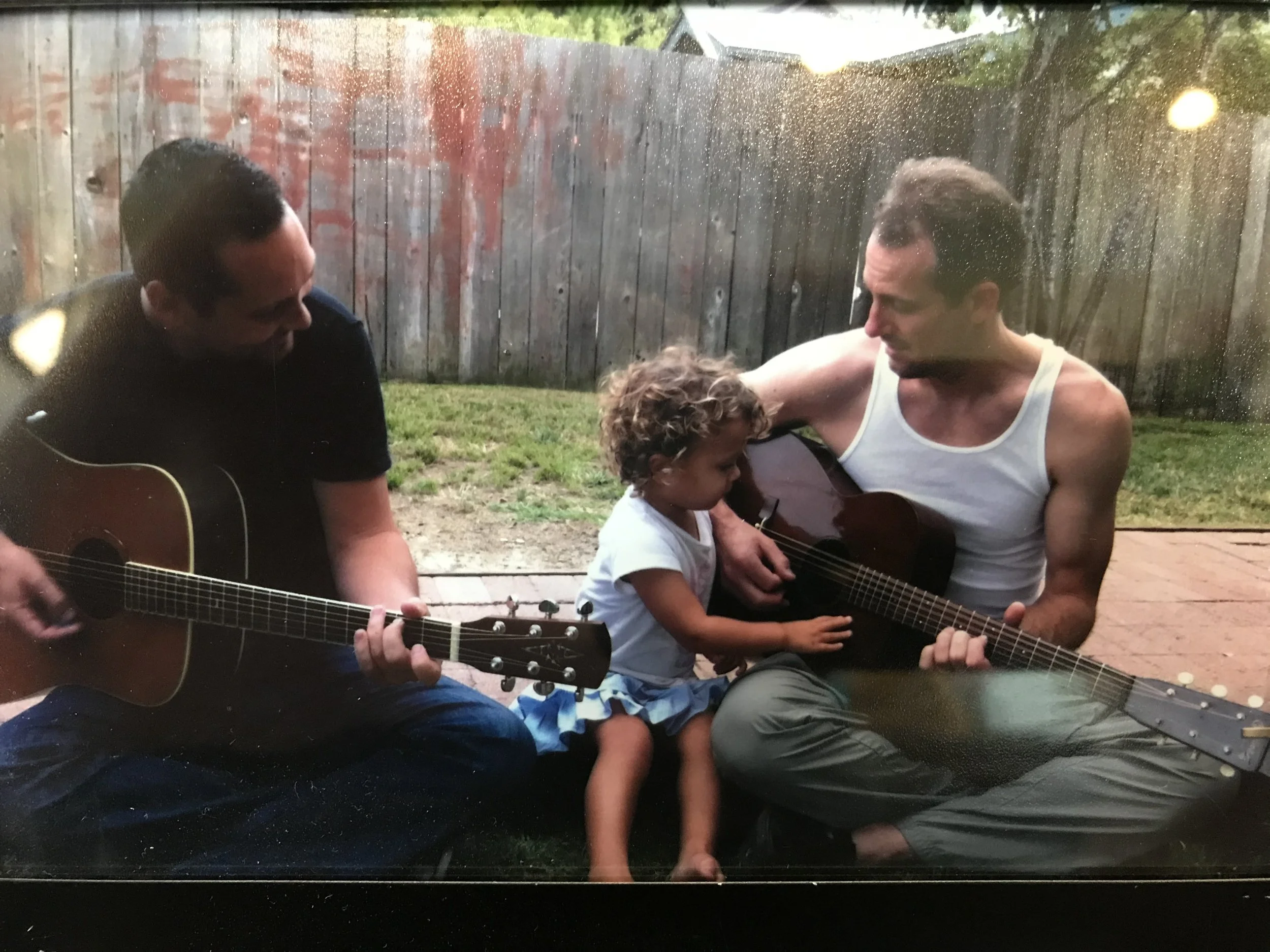 Early inspiration, 2011. Boswell playing his early all-mahogany guitar to his daughter’s delight.