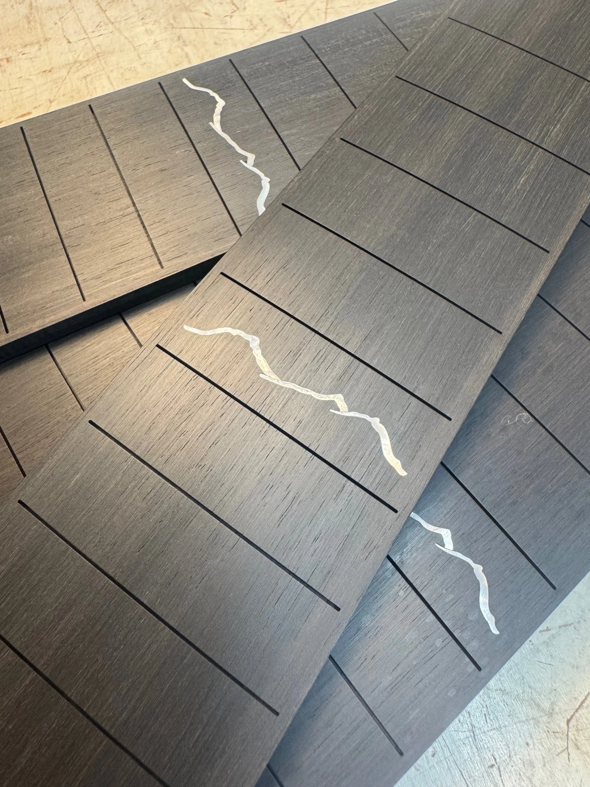Peg head overlay: Gaboon Ebony with pearl ‘Boswell’ inlay,